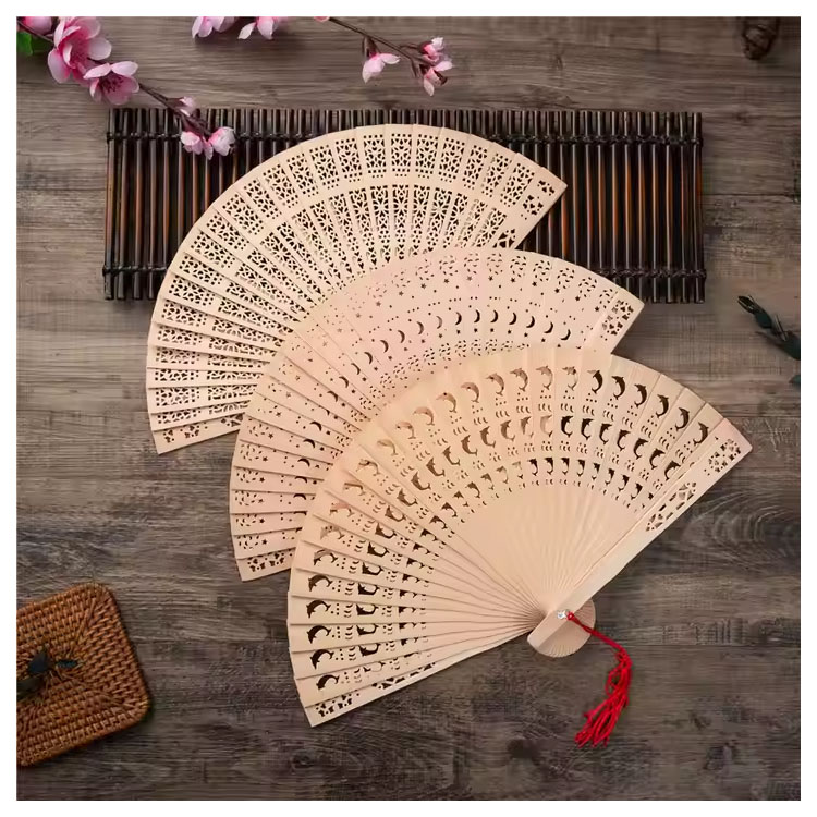 Každý vějíř, který je odborně vyroben z přírodního bambusu, předvádí složité vyřezávané vzory a hladké povrchové úpravy, které evokují tradiční eleganci. Dokonalá kombinace funkčnosti a estetiky, ideální pro večírky s vintage tématikou, venkovní svatby nebo kulturní akce.