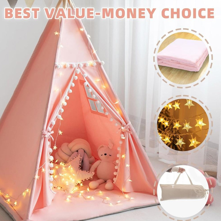 Dětský teepee stan z bavlněného plátna pro děti s podložkou. Váš dokonalý kouzelný herní prostor pro kreativní dobrodružství. Tento stan týpí z bavlněného plátna obsahuje pohodlnou podložku, kouzelná hvězdná světla a praktické pouzdro. Perfektní pro inspirativní imaginativní hru a vytváření trvalých vzpomínek na dětství.