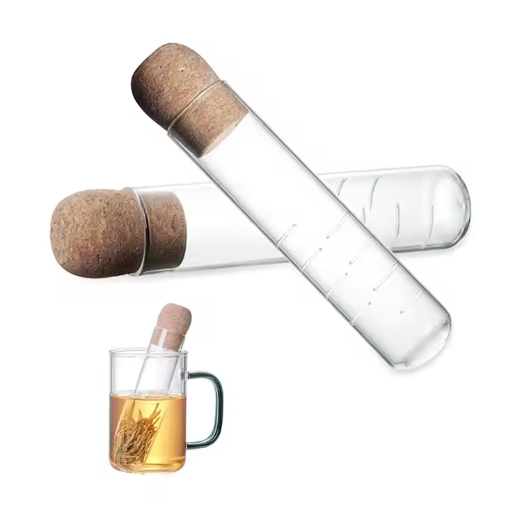 Konstrukční tvar trubice Borosilicate Glass Tea Infuser Infuser Stigter.Modern Trube Tvar Borosilicate Glass Tea Infuser Bottle s přírodním korkovým víkem pro volné vaření listů, elegantní a tepelně rezistentní design pro domov, kancelář nebo cestovní milovníky čaje, kteří hledají stylový a funkční pivovarkový zážitek.