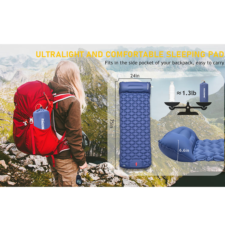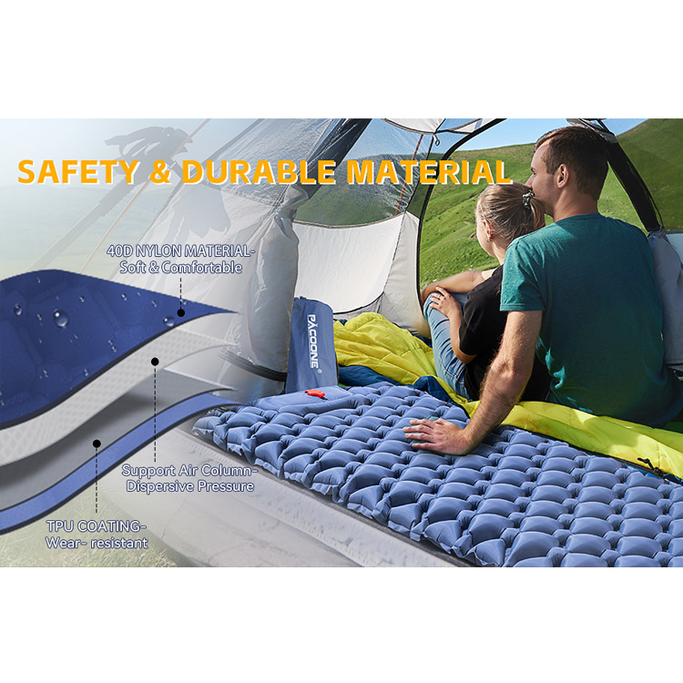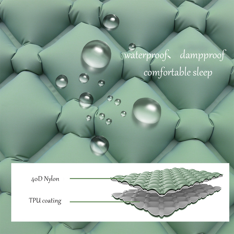Lehký nylonový materiál skládací podložka na spaní pro kempingový stan. Vaše dokonalé přenosné řešení spánku pro dobrodružství v přírodě. Tato ultralehká nafukovací matrace nabízí nafukování jedním stisknutím a integrovaný design polštáře. Vyrobeno z odolného nylonového materiálu, poskytuje vynikající pohodlí pro turistiku a kempování a zajišťuje klidné noci kdekoli.